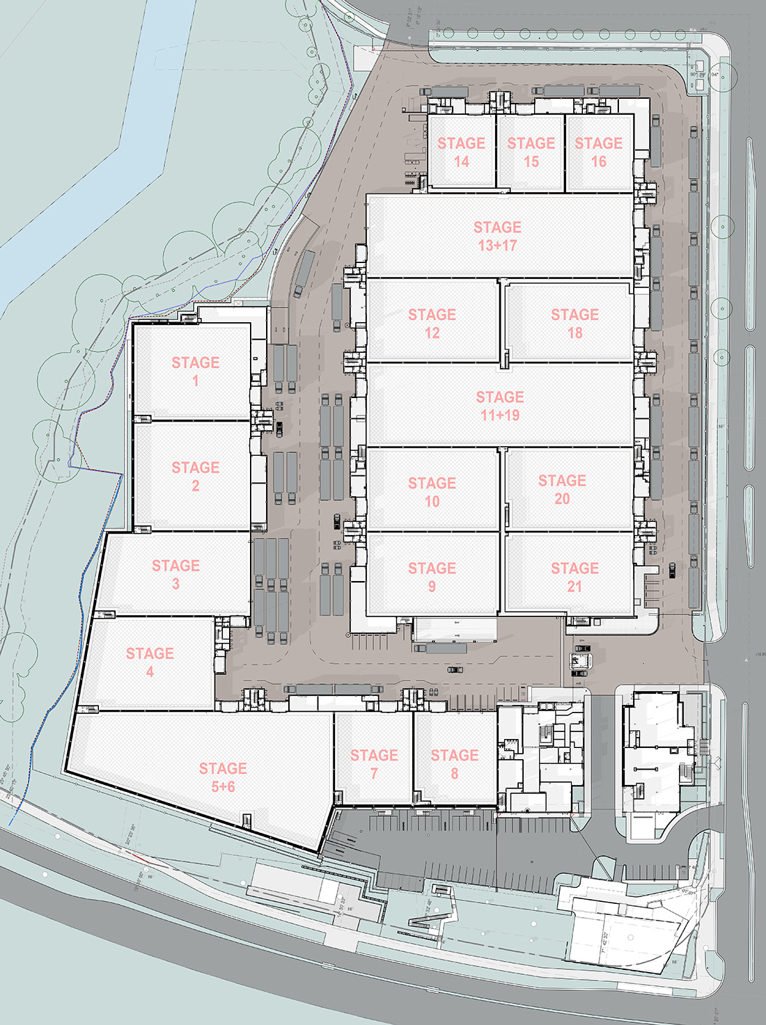 The L-shaped building contains eight soundstages alongside administrative and production offices. The other building houses the remaining soundstages and their dedicated support spaces. Each soundstage operates as its own sealed ecosystem, with separate security, services, and amenities — reflecting the high value of secrecy in modern film production.