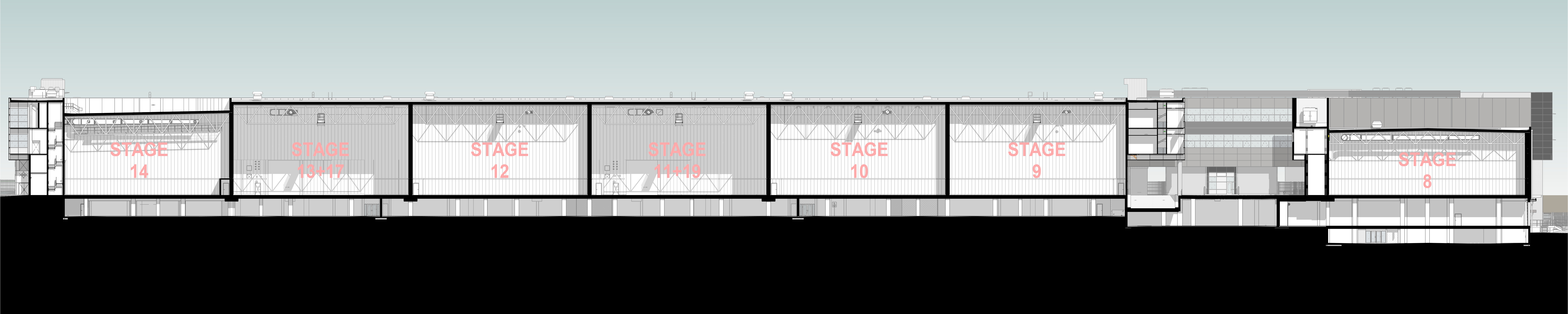 Inside the soundstages, there are no columns. Spans of steel beams and open-web joists push the limits of what can be transported and erected on site. Ceiling heights range from 50 ft. to as much as 75 ft. clear, allowing for lighting rigs, suspended vehicles, flying stunts, and complex camera movements.