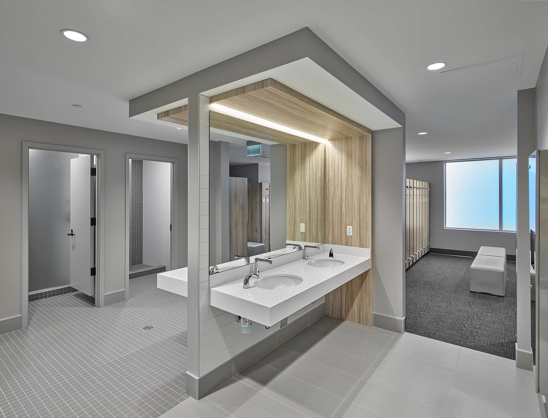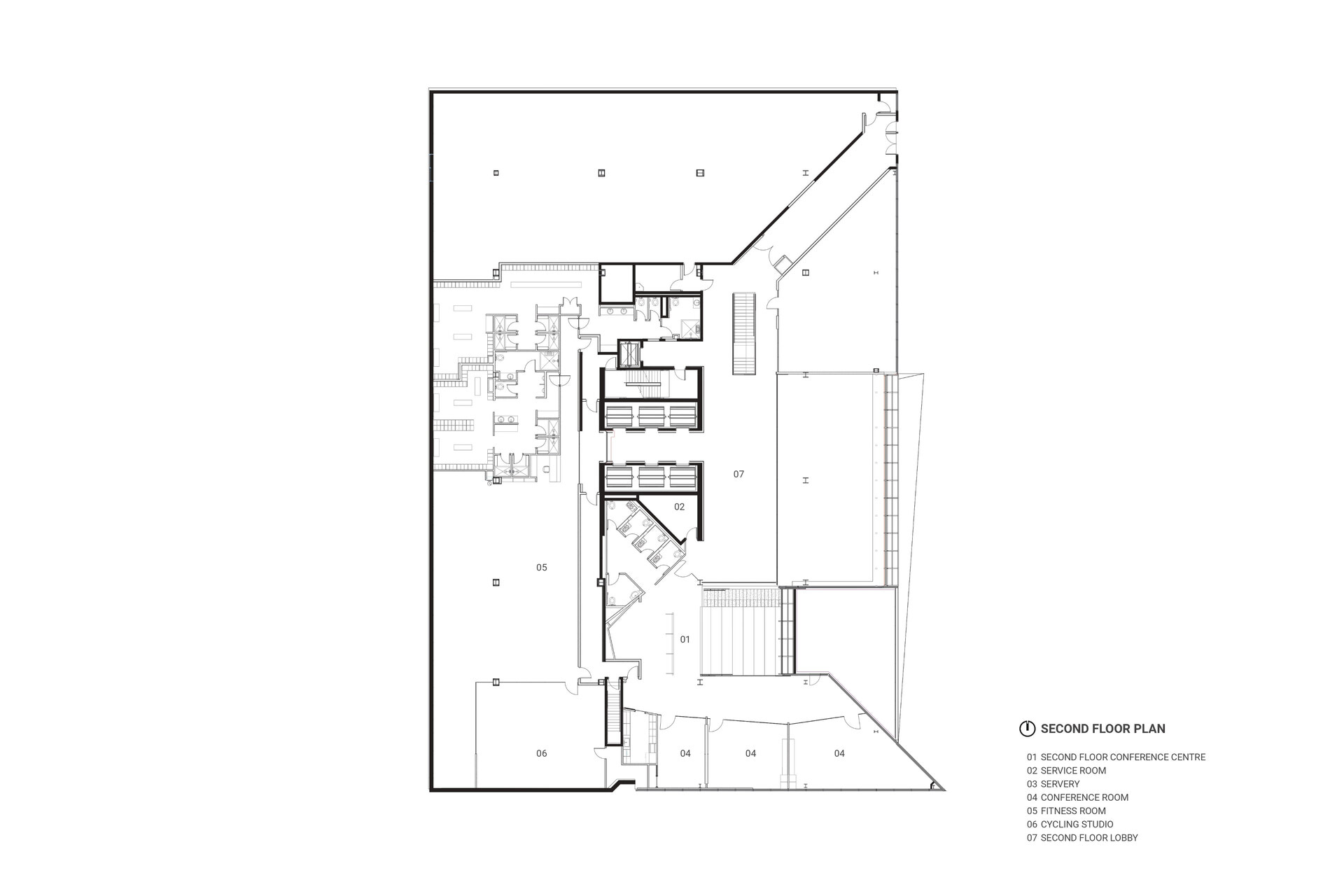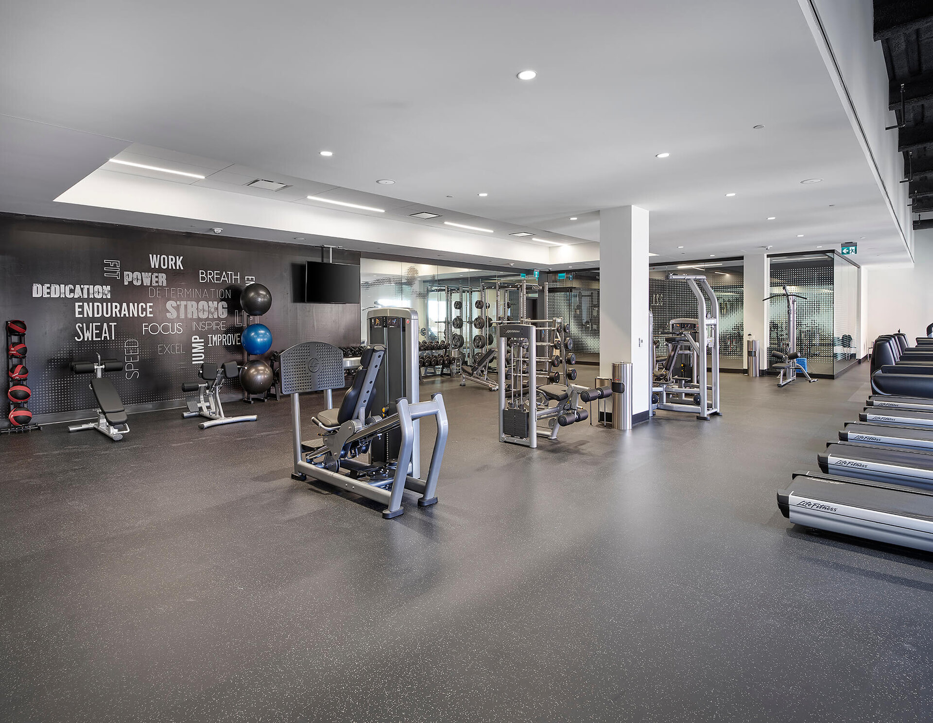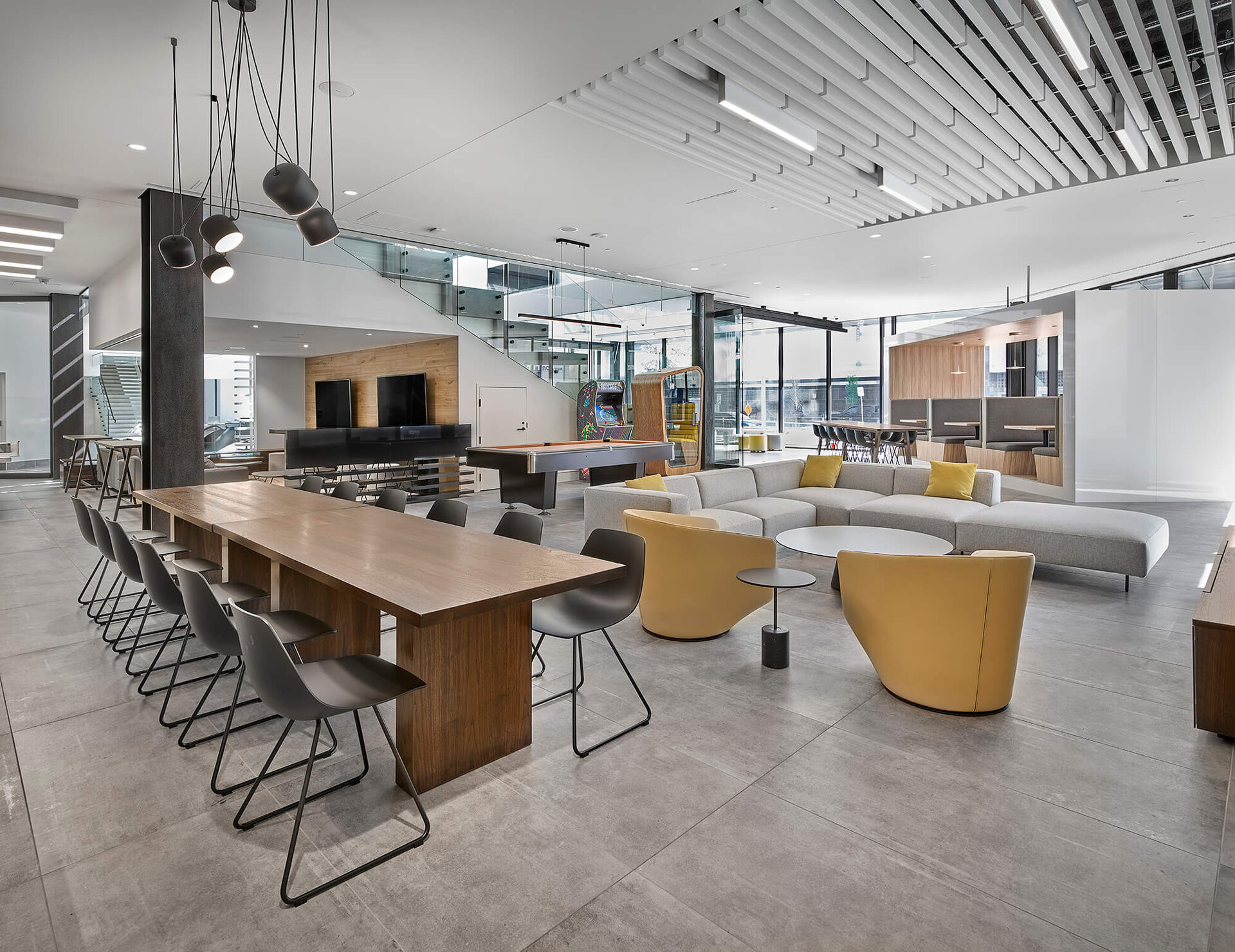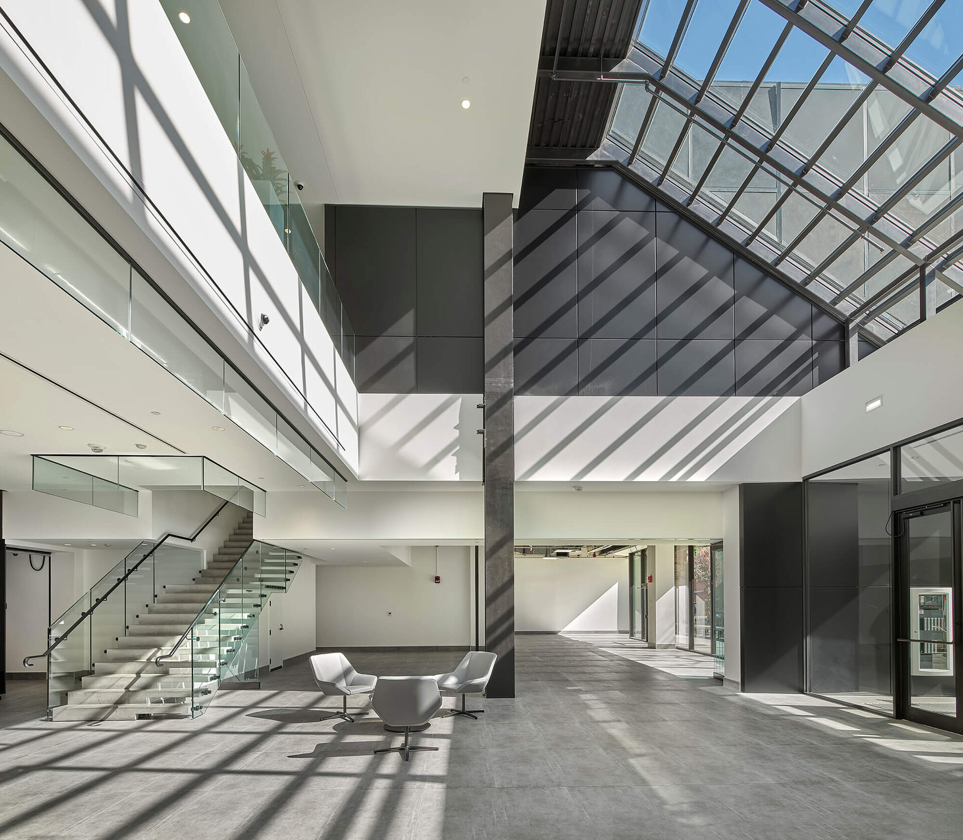 Parts of the building’s identity are further celebrated by highlighting the unified monochromatic industrial design aesthetic, which is visible throughout the contemporary tenant lounge, collaborative spaces and fitness center. A new front plaza, tenant exterior amenity and patio area were created for additional main floor commercial use.