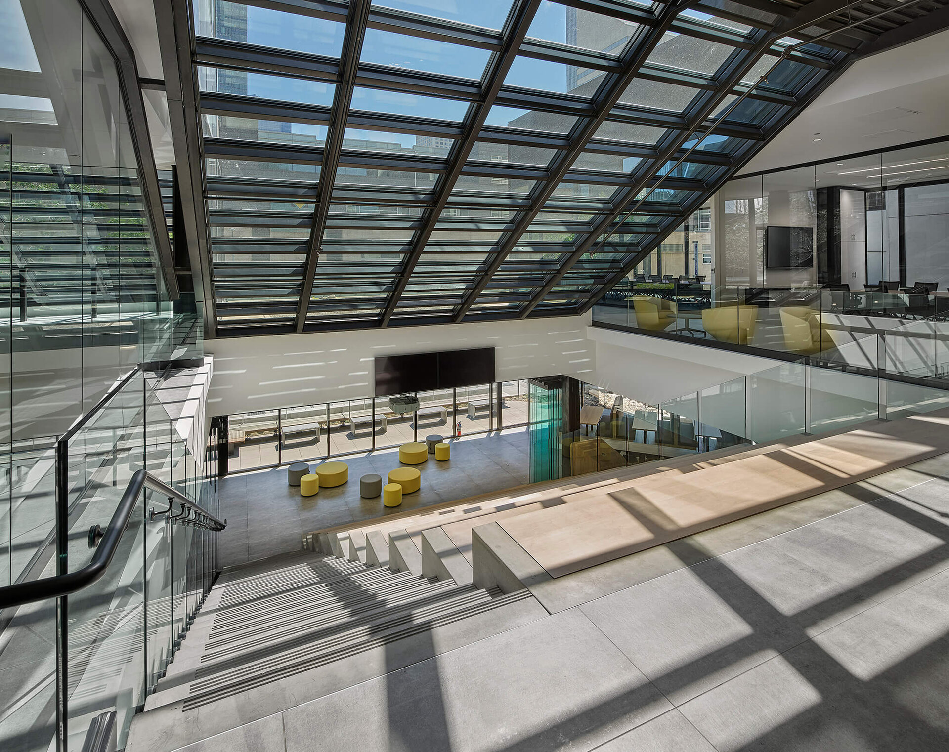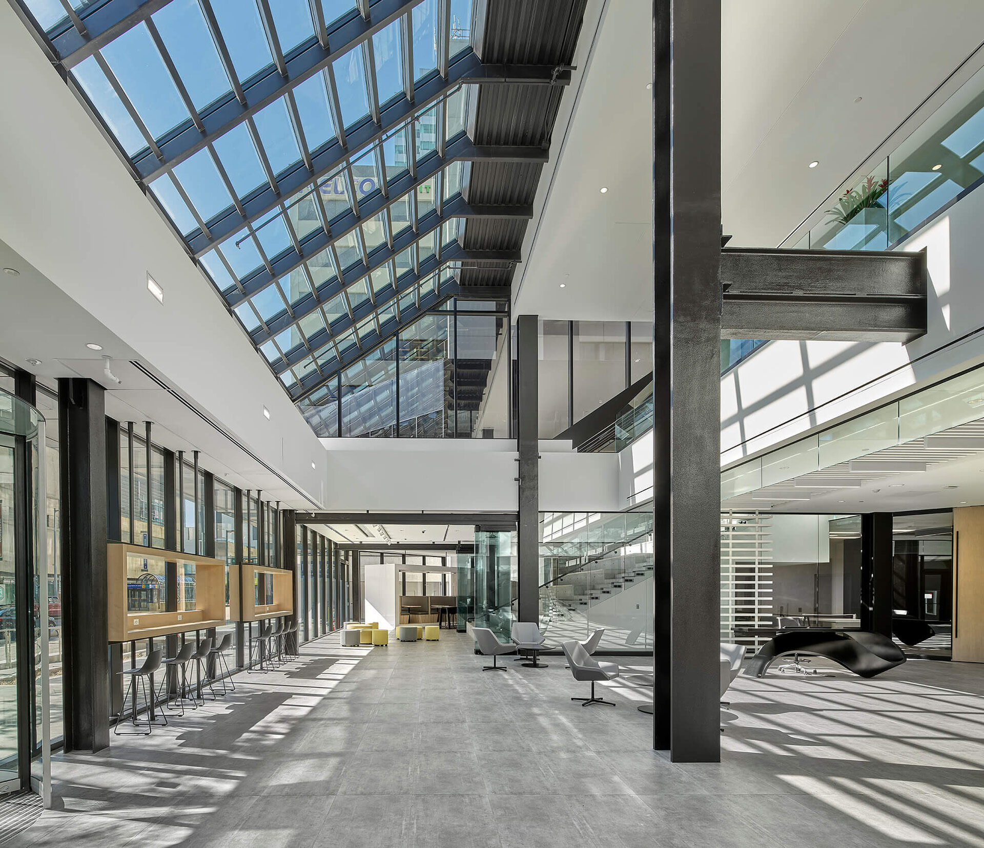 Connecting the unique podium double skylights to a sunbathed interior was done by removing portions of the second-storey floor and walls to expose the building’s steel structure. The result was a dramatic two-storey volume that connects people to a light-filled open concept with an industrial aesthetic.