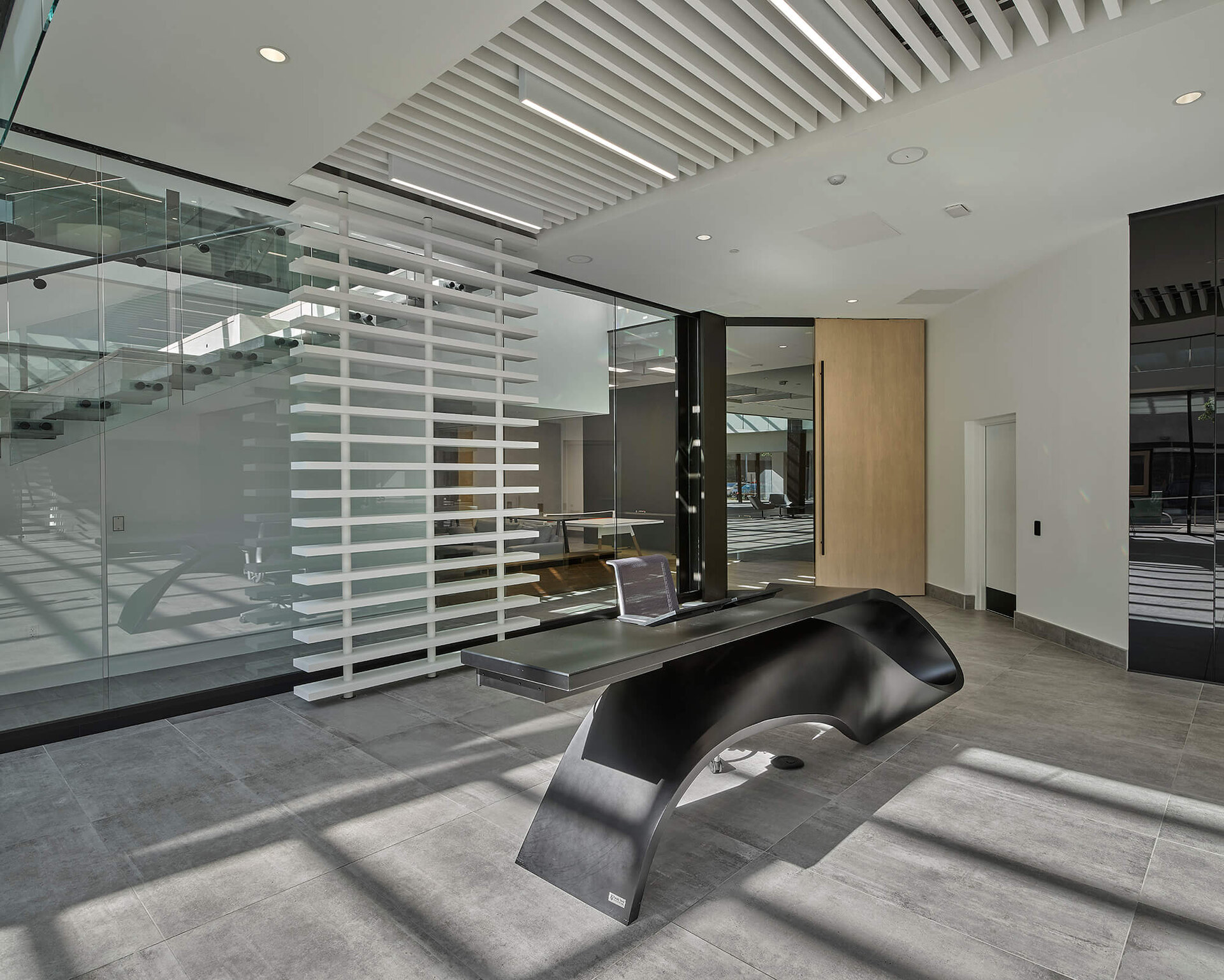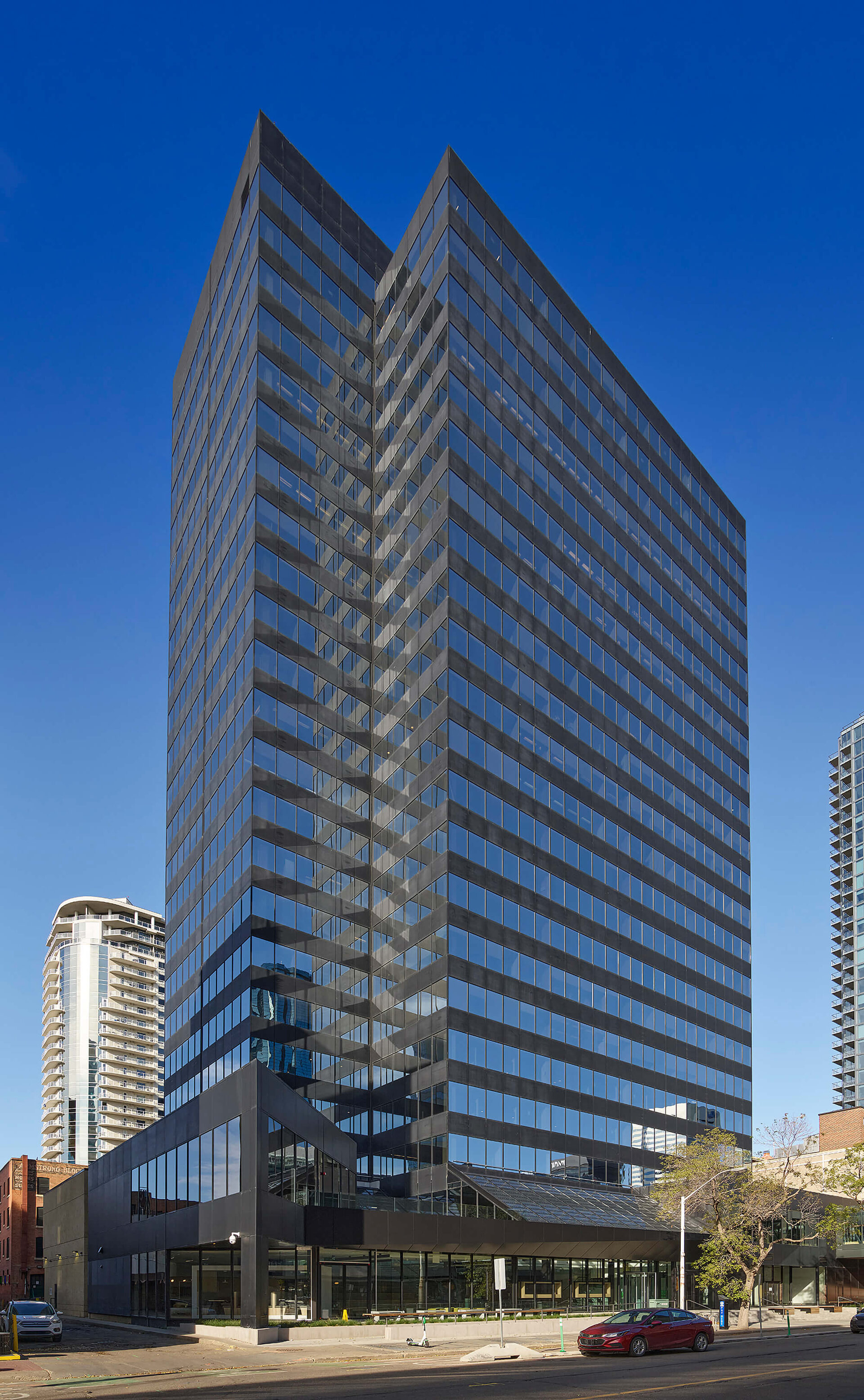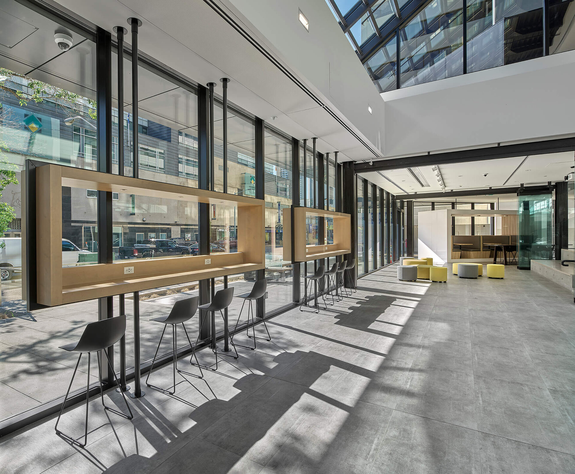 The tower’s dark façade is commemorated by an abiding design language throughout the architecture. Darker exterior elements are maintained along with a new compelling black canopy that fortifies the dynamic entrance. This new, much more transparent intervention at the podium, replaces the former opaque and heavy canopy and brings the energy of the street to the face of the building.